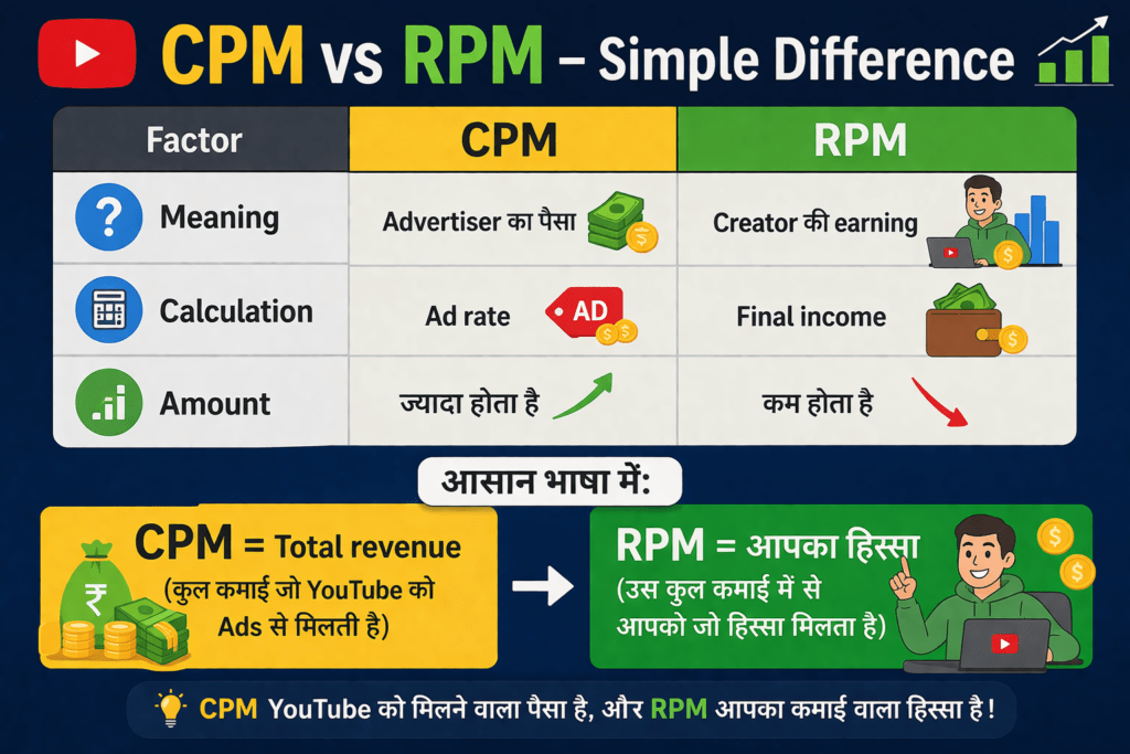 आज के समय में बहुत सारे creators सिर्फ views के पीछे भागते हैं, लेकिन असली game CPM और RPM का है। अगर आपको यह समझ में नहीं आता कि CPM vs RPM क्या है, तो आप कभी भी अपनी YouTube income को सही तरीके से optimize नहीं कर पाएंगे।